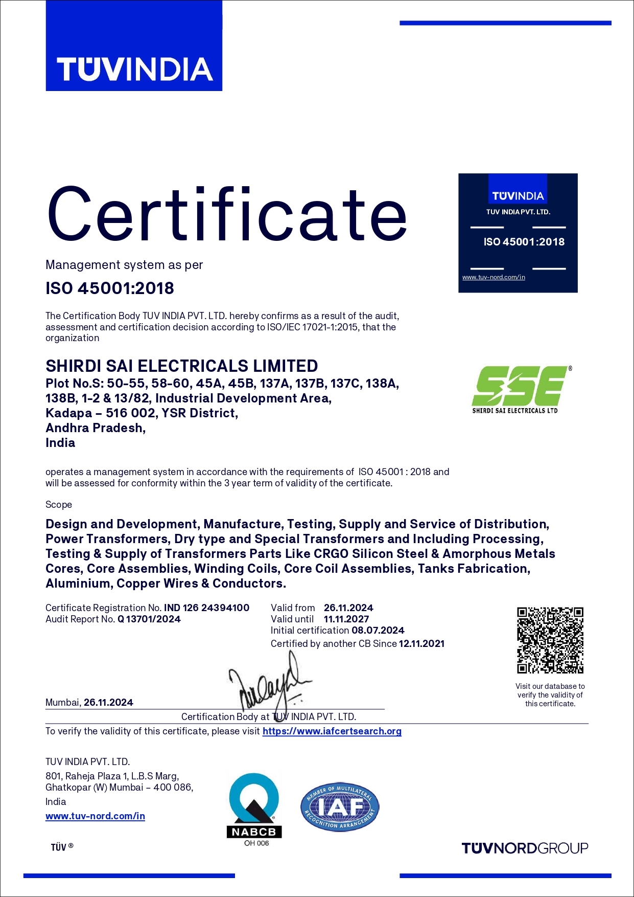 At SSEL, we adhere to globally benchmarked systems that ensure uncompromised quality, sustainable practices, and the highest standards of occupational health and safety. Recognitions and accreditations from leading international and national bodies reaffirm our commitment to delivering reliable solutions while maintaining excellence in operations, compliance, and customer satisfaction.